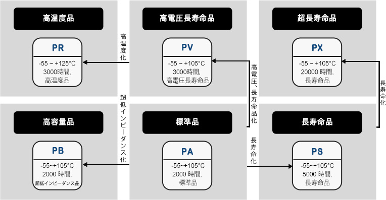 | 高容量品 | PB | 高容量、超低インピーダンス品 | -55~+105 | 2.5~16 | 270~1500 | 2000 | |||||